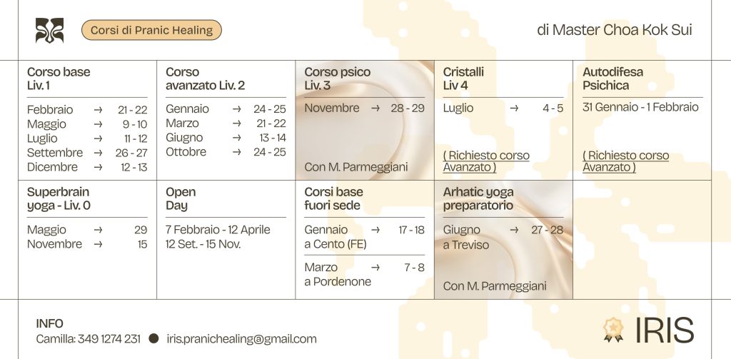Compila il modulo e unisciti a noi per vivere un’esperienza di crescita, scoperta e connessione. Gli eventi organizzati da IRIS sono momenti speciali in cui potrai conoscere da vicino il mondo del Pranic Healing, partecipare a meditazioni guidate, workshop e incontri con altri appassionati del benessere energetico e spirituale.